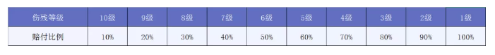 如上圖,傷殘等級分為十級,1級最嚴重,10級最輕,賠付比例也分為10檔,10級賠付保額的10%,9級賠付保額的20%,以此類推。