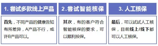線上產(chǎn)品和智能核保都行不通,最后還可以進行人工核保,目前線上/線下都可以,通過人工核保,得到最終的結果。
