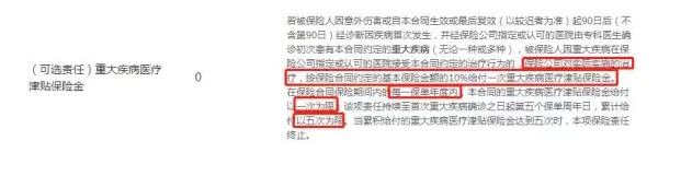 即:確診重疾后,在指定醫(yī)院治療的,每年給付一次額外10%基本保額的保險金,持續(xù)至確診日后的第5個保單日,累計給付5次。