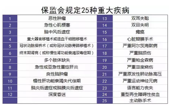 保監(jiān)會(huì)制定了25種重大疾病,要求所有重疾險(xiǎn)都必須包含它們,并且疾病定義和理賠標(biāo)準(zhǔn)都必須一樣,不準(zhǔn)修改。而這25種重大疾病,已經(jīng)占了所有重疾理賠的95%以上。