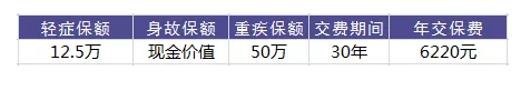 張先生今年30周歲,購(gòu)買(mǎi)達(dá)爾文1號(hào),重疾保險(xiǎn)金額50萬(wàn)元,輕癥疾病保險(xiǎn)金額12.5萬(wàn)元,交30年,保險(xiǎn)期間保至終身,每年繳納保費(fèi)6220元。