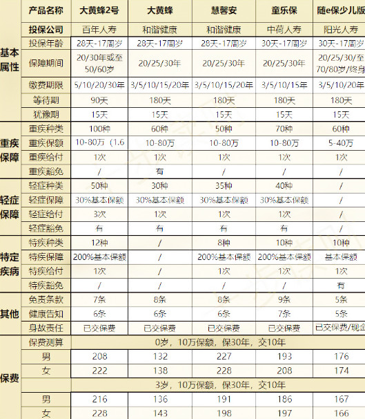 當(dāng)然,其他幾種產(chǎn)品也各有優(yōu)勢。如果預(yù)算有限,你可以考慮和諧健康的大黃蜂; 慧馨安有“8種兒童特定疾病,最大損失160萬”,這也是一個亮點。