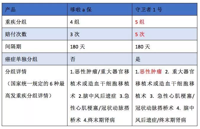 與產品相比不僅可以超過價格,哆啦A保的覆蓋范圍可以說是非常全面和科學的,而輕癥2次嚴重疾病2次的安排更為合適。所以除了價格和賠付次數(shù),保障中的守衛(wèi)者1號細節(jié)上,有什么優(yōu)勢呢?