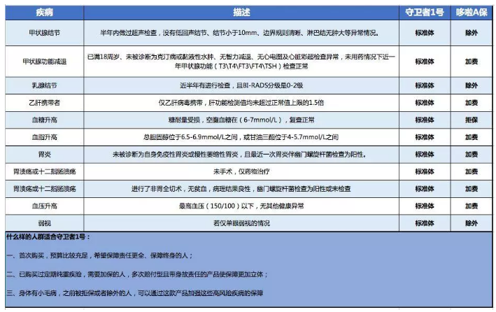 除了以上亮點之外,守衛(wèi)者1號本身還有另一個優(yōu)點,就是它可以是智能核保,并且一直延續(xù)百年人壽的特性,核保相對寬松。甲狀腺結節(jié)、乳腺結節(jié)、乙肝攜帶者甚至輕微三高人群可根據標準體保險,簡直就是這些輕度疾病患者的福音: