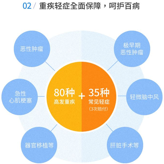 2.輕癥3次未分組,保險(xiǎn)金額可以達(dá)到75%,輕癥最多可以支付3次,每次可以支付25%的重大疾病保險(xiǎn)金額,并包含5種類型的輕癥