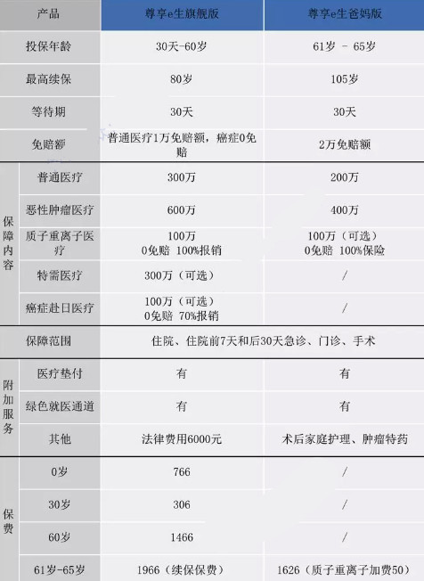 尊享e生爸媽版的保障內(nèi)容類似于尊享e生旗艦版e,并且由重大事故或疾病引起的住院費用的報銷不限制醫(yī)療保險的內(nèi)外。