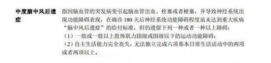 這種疾病是今年市場(chǎng)上疾病的一個(gè)新定義。其實(shí)質(zhì)是將高發(fā)的輕癥定義為中癥,并將其增加賠付保額。讓我們看看同一輕度中風(fēng)和中度中風(fēng)后遺癥的定義;