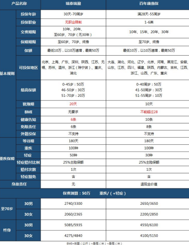 此外,瑞泰瑞盈有一個(gè)小優(yōu)勢(shì),并且不需要被保險(xiǎn)人的BMI指數(shù)。例如,在百年康惠保中,被保險(xiǎn)人的BMI不得超過(guò)28。這意味著如果保險(xiǎn)指數(shù)不符合標(biāo)準(zhǔn),但身體沒(méi)有異常,則可能無(wú)法確保這一重大疾病保險(xiǎn),或做核保處理。但瑞盈顯然更友好。