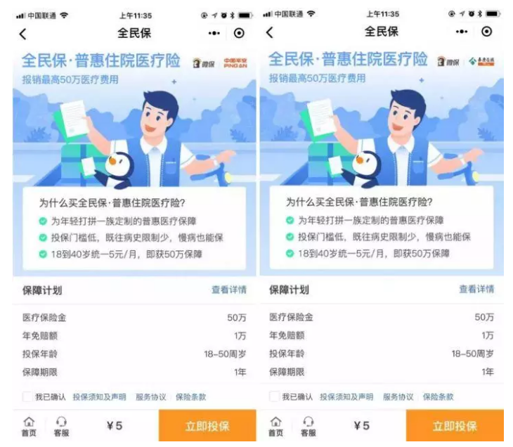 “全民保·醫(yī)療保險”承保方有兩個,一家是平安養(yǎng)老,另一家是泰康在線。不同的用戶在從不同的路徑進入時會看到不同的公司,但責任是相同的。