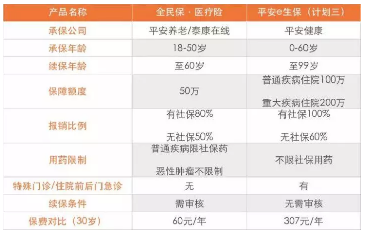 事實上,仔細觀察,“全民保”是經典百萬醫(yī)療產品的“瘦身版”,多保魚將其與平安e生保進行比較。