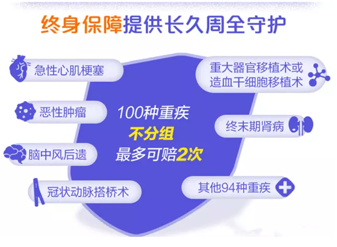 一:康惠保多倍版的100種重病賠付,從市場(chǎng)上一次普通的賠付變?yōu)榉欠纸M兩次賠付。不分組的優(yōu)點(diǎn)是獲得賠付的概率更高,100%基本保額的2次賠付,突破市場(chǎng)中的賠付限制,使得第二個(gè)賠付更加實(shí)用,提供更長(zhǎng)和更全面的監(jiān)護(hù)終身保障。兩種主要疾病之間的間隔是365天,并且是第一次支付重大疾病保險(xiǎn)金后,而豁免期間無(wú)需支付保費(fèi)。