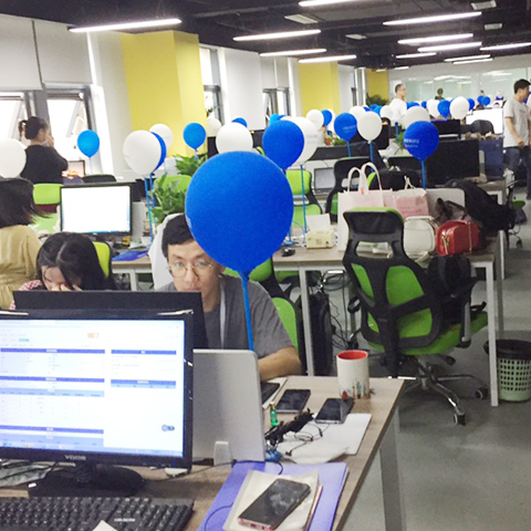 (公司整個工位上都放有藍(lán)白相間的氣球,遠(yuǎn)遠(yuǎn)望去就像一片藍(lán)藍(lán)的大海一樣,也希望多保魚這條小魚在互聯(lián)網(wǎng)金融的大海之上乘風(fēng)破浪,勇往直前。)
